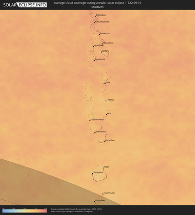 Die folgenden Karten zeigen die durchschnittliche Bewölkung für den Tag, an dem die ringförmige Sonnenfinsternis