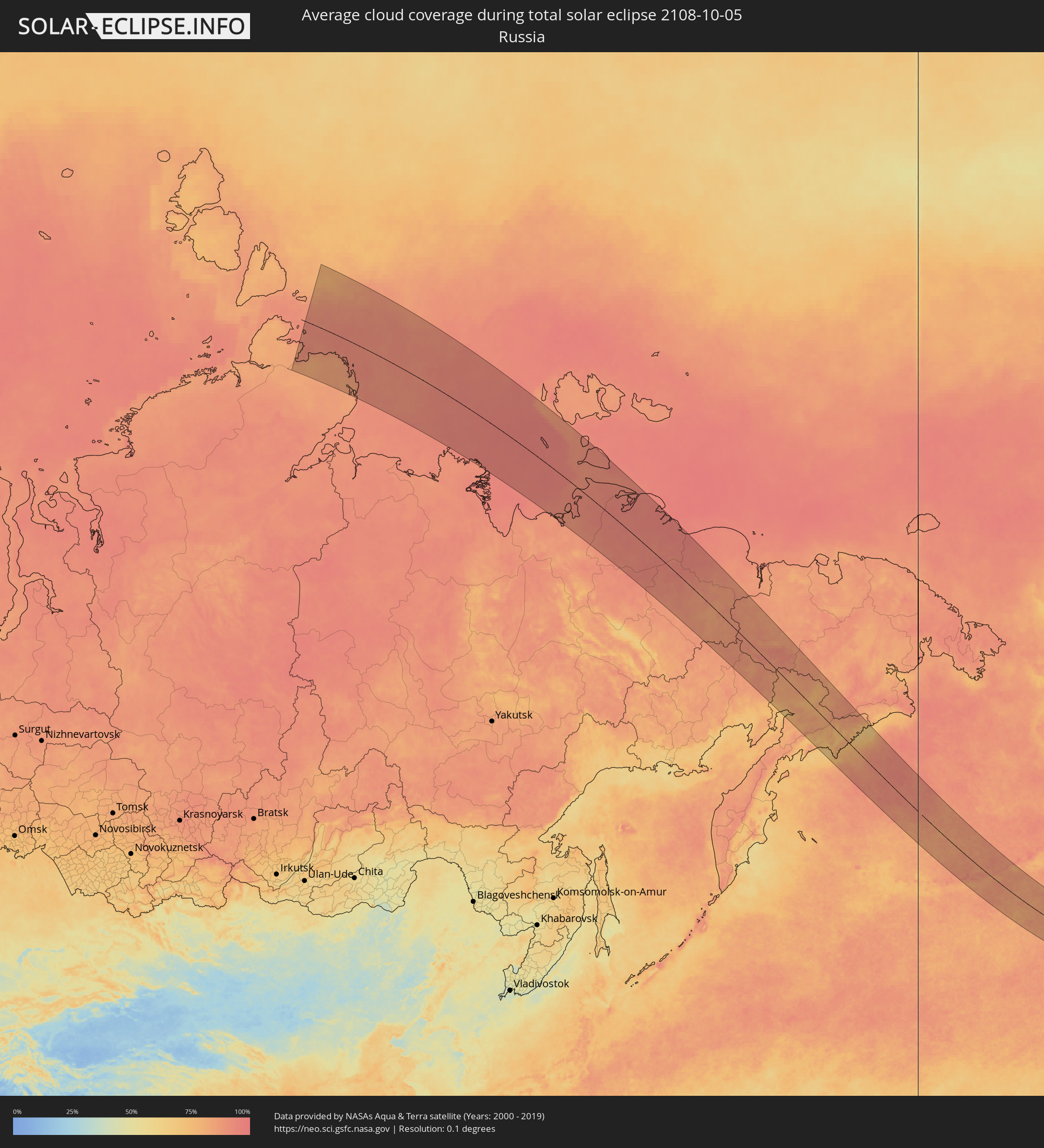 Die folgenden Karten zeigen die durchschnittliche Bewölkung für den Tag, an dem die totale Sonnenfinsternis