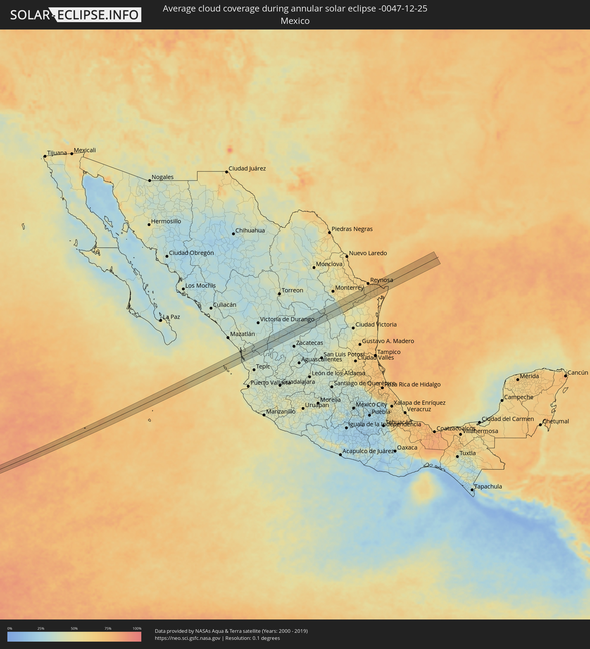 The following maps show the average cloud coverage for the day of the annular solar eclipse.