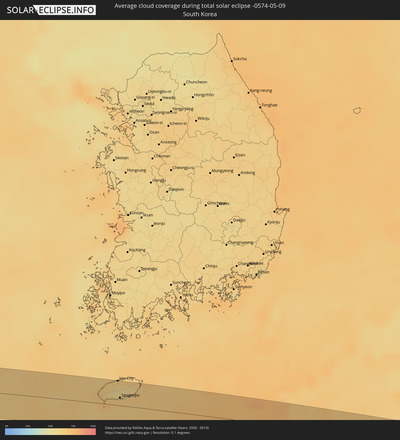 Die Sonnenfinsternis am 05/09/-0574 kann man in 94 Ländern als partielle Sonnenfinsternis beobachten.