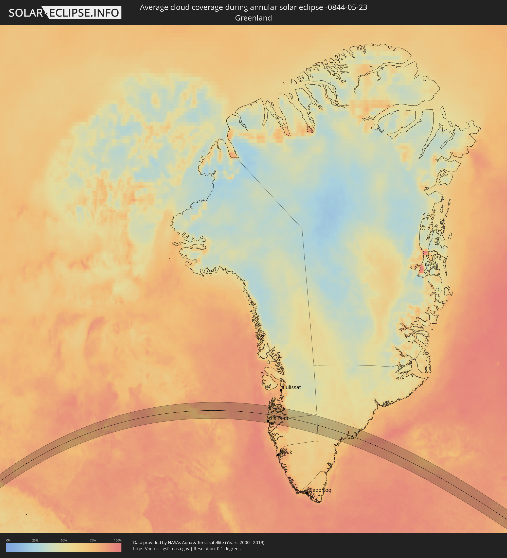 The following maps show the average cloud coverage for the day of the annular solar eclipse.