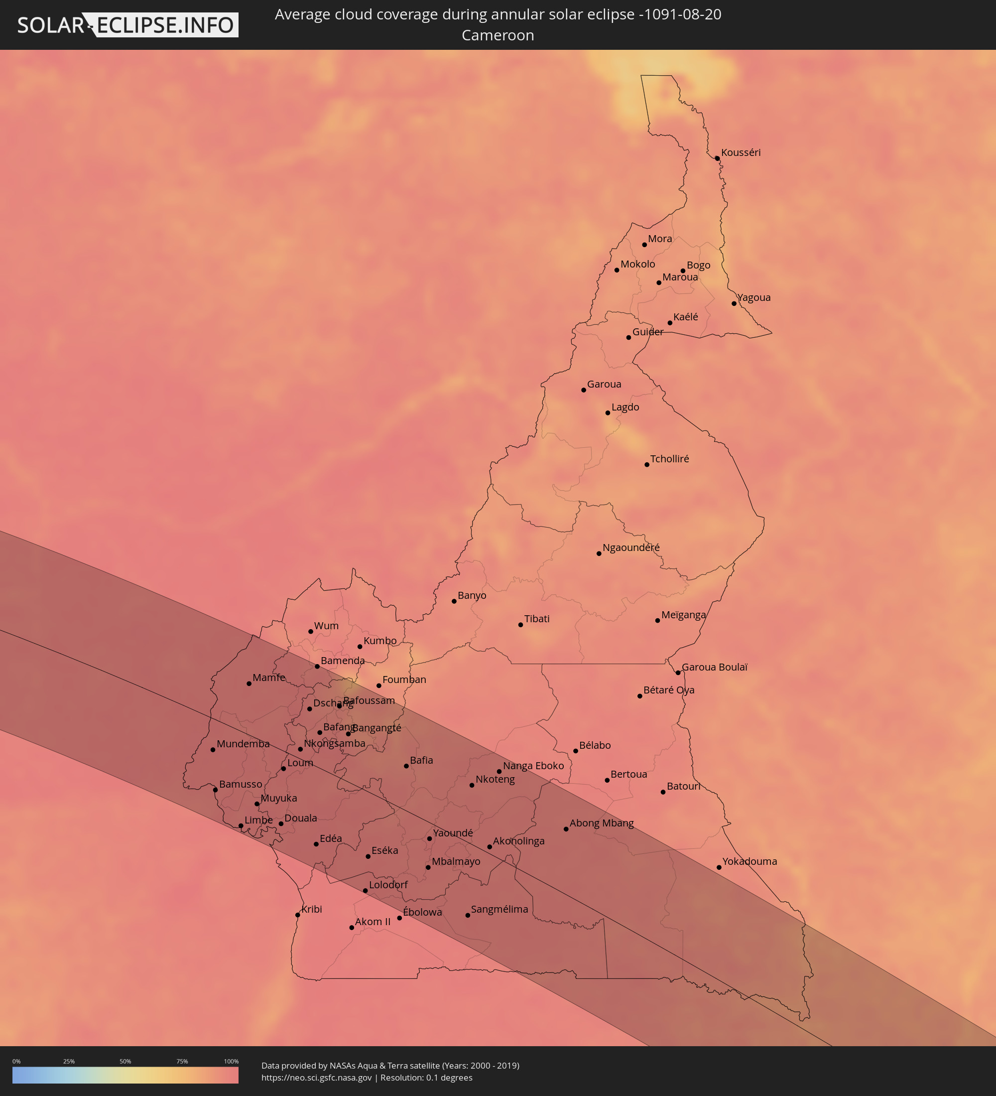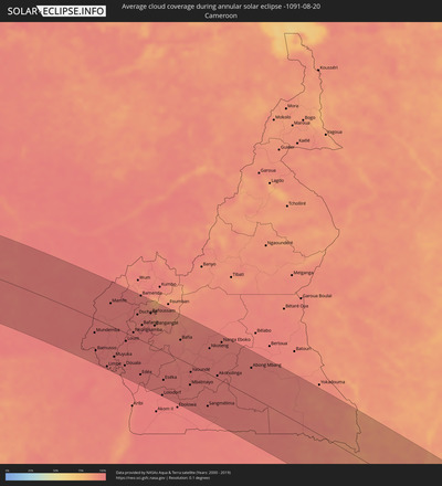 The following maps show the average cloud coverage for the day of the annular solar eclipse.