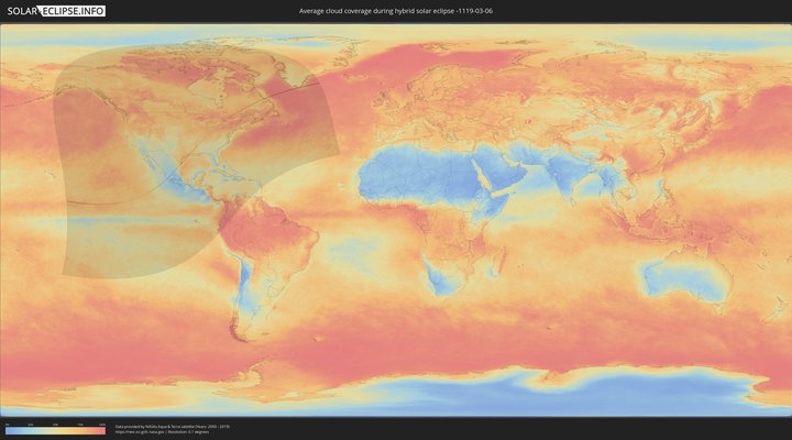 The following maps show the average cloud coverage for the day of the hybrid solar eclipse.