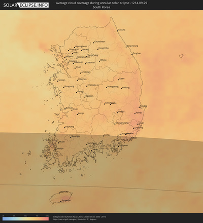 The following maps show the average cloud coverage for the day of the annular solar eclipse.