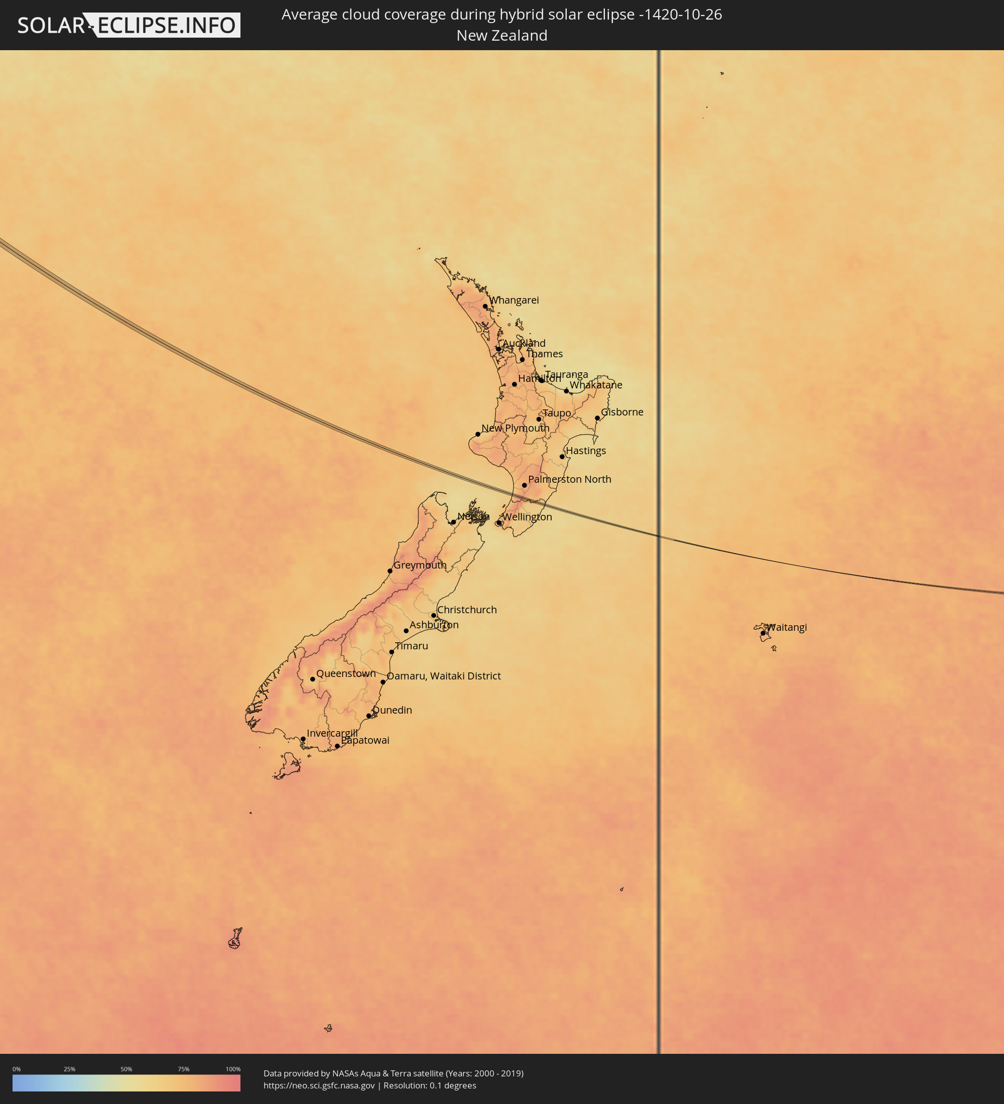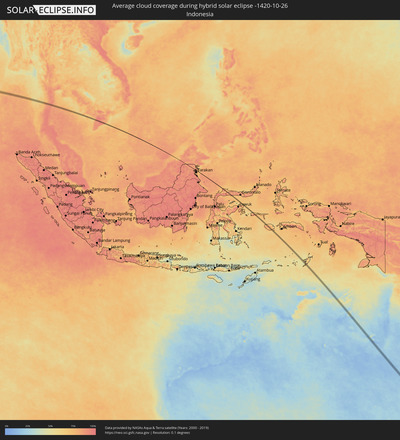 The following maps show the average cloud coverage for the day of the hybrid solar eclipse.