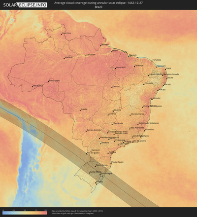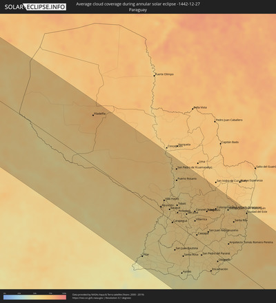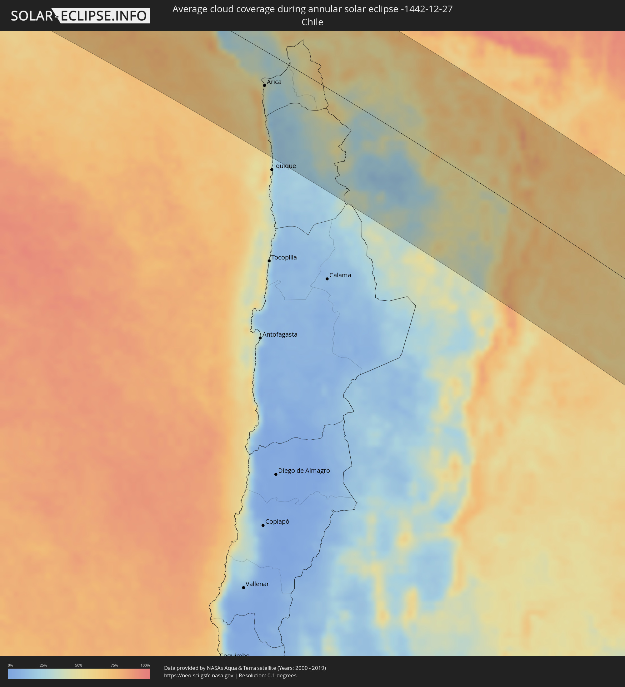 The following maps show the average cloud coverage for the day of the annular solar eclipse.