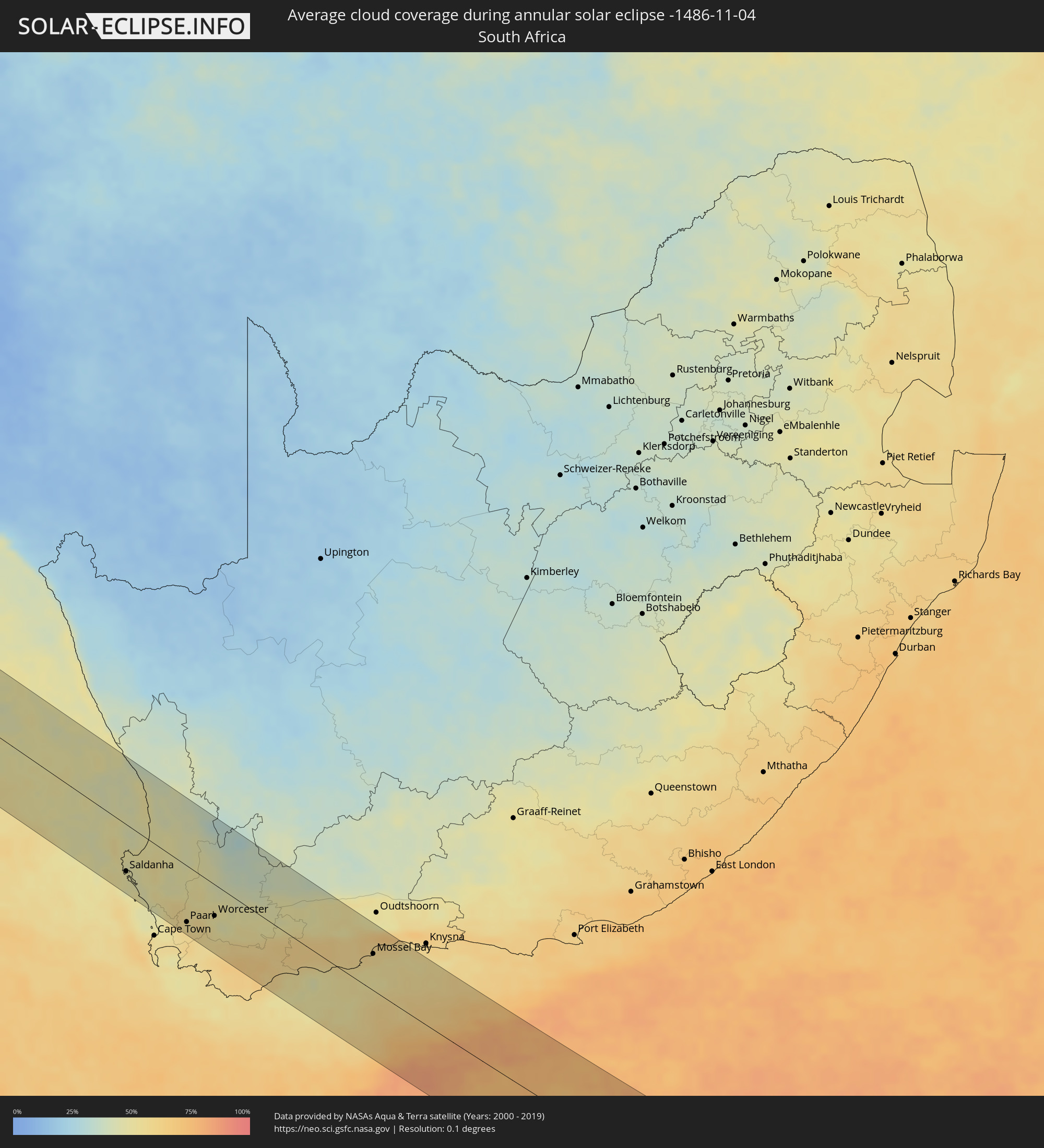 The following maps show the average cloud coverage for the day of the annular solar eclipse.
