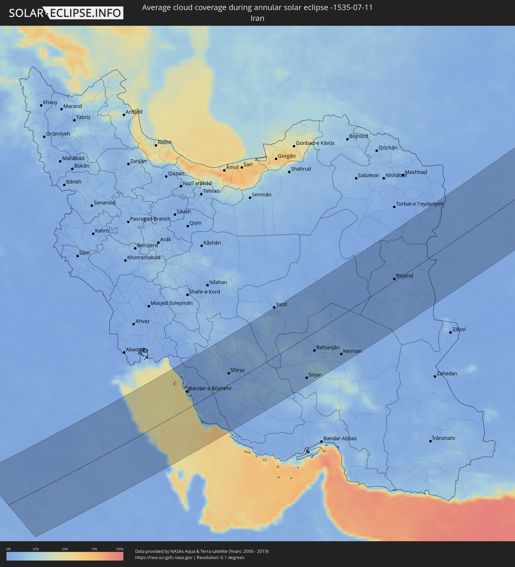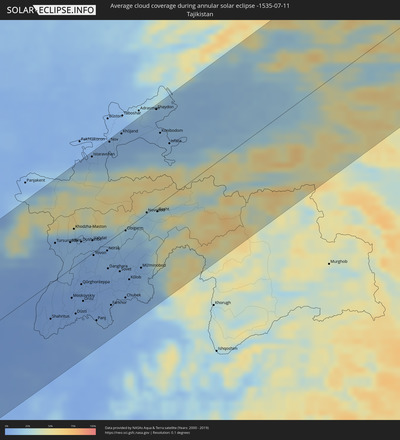 The following maps show the average cloud coverage for the day of the annular solar eclipse.
