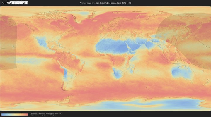 The following maps show the average cloud coverage for the day of the hybrid solar eclipse.