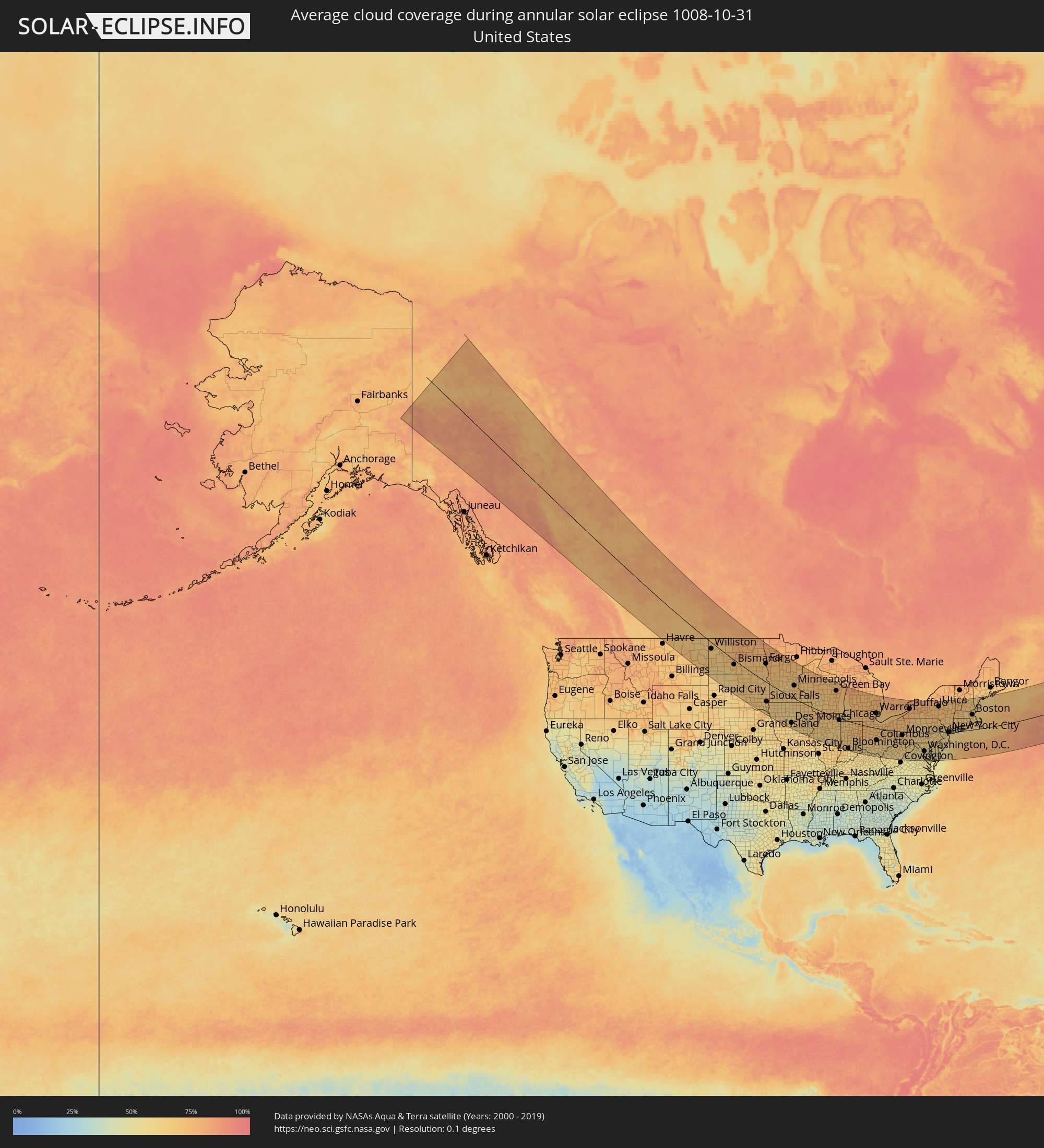 The following maps show the average cloud coverage for the day of the annular solar eclipse.