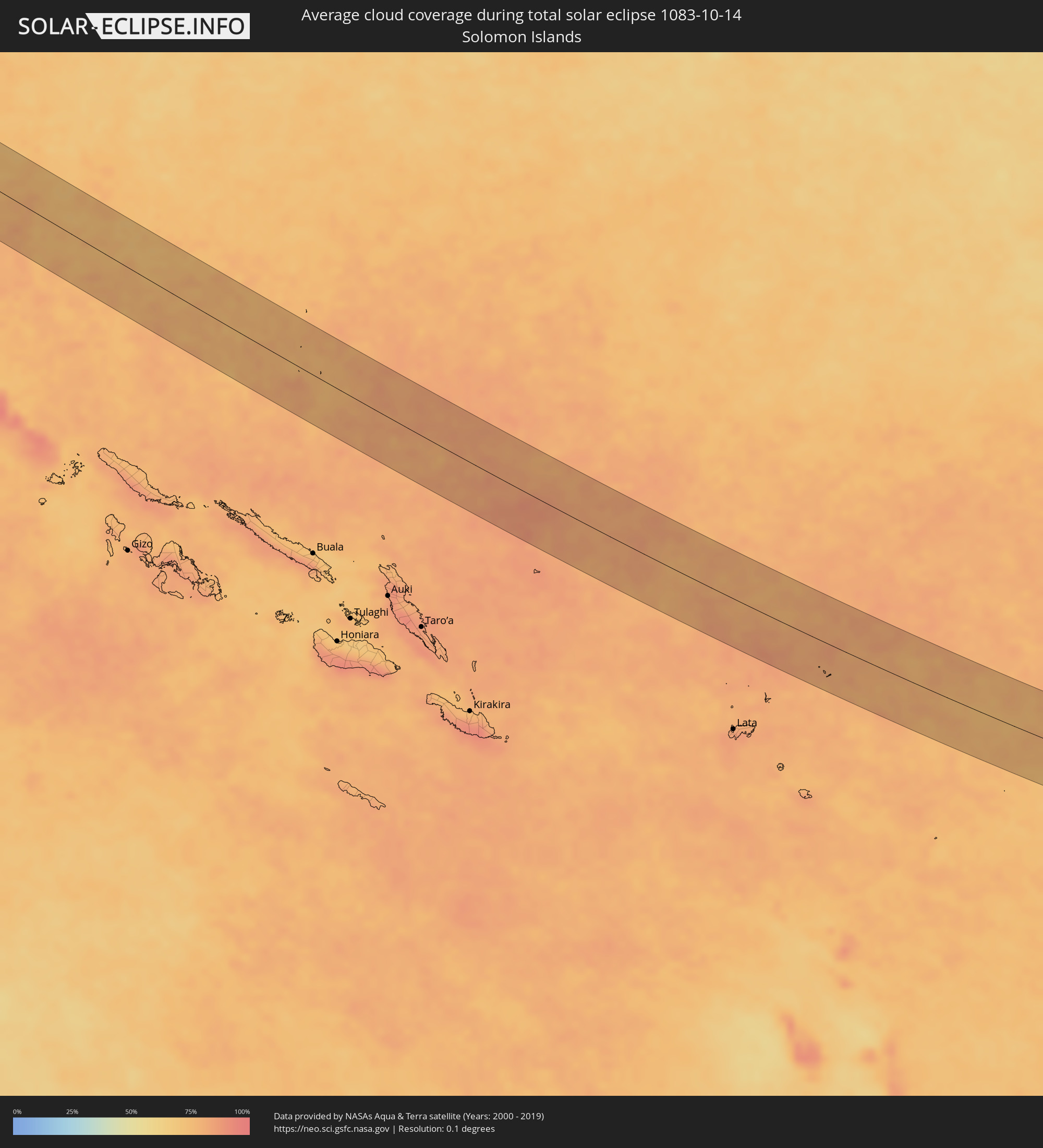 The following maps show the average cloud coverage for the day of the total solar eclipse.