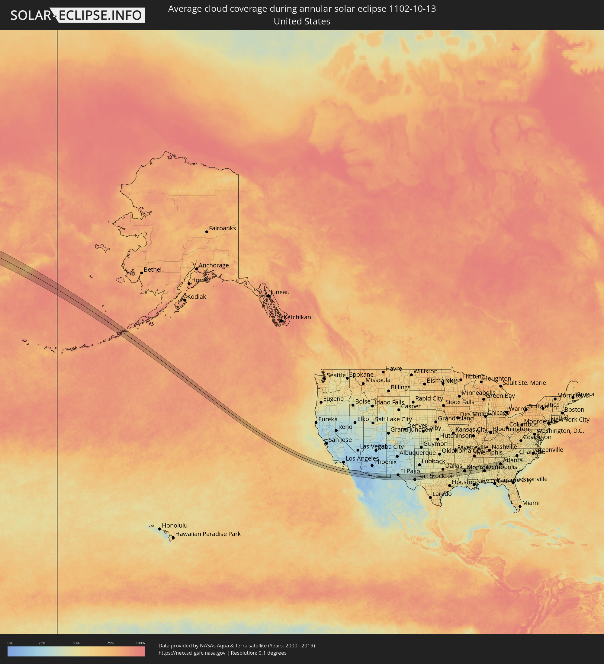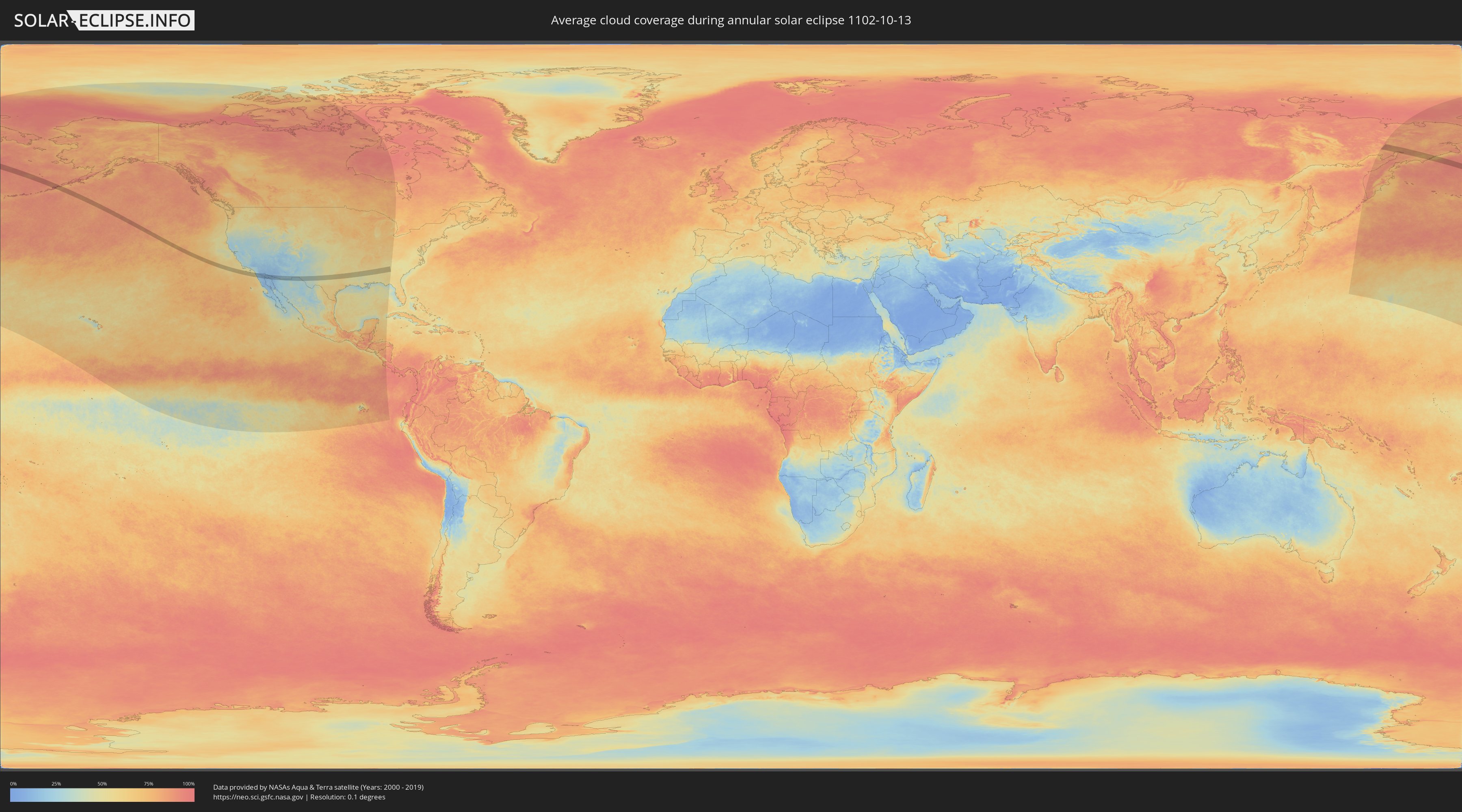 The following maps show the average cloud coverage for the day of the annular solar eclipse.