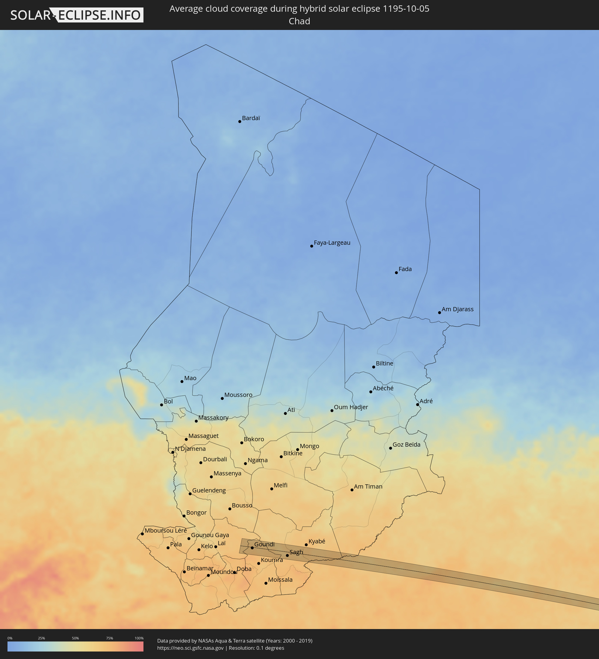 The following maps show the average cloud coverage for the day of the hybrid solar eclipse.