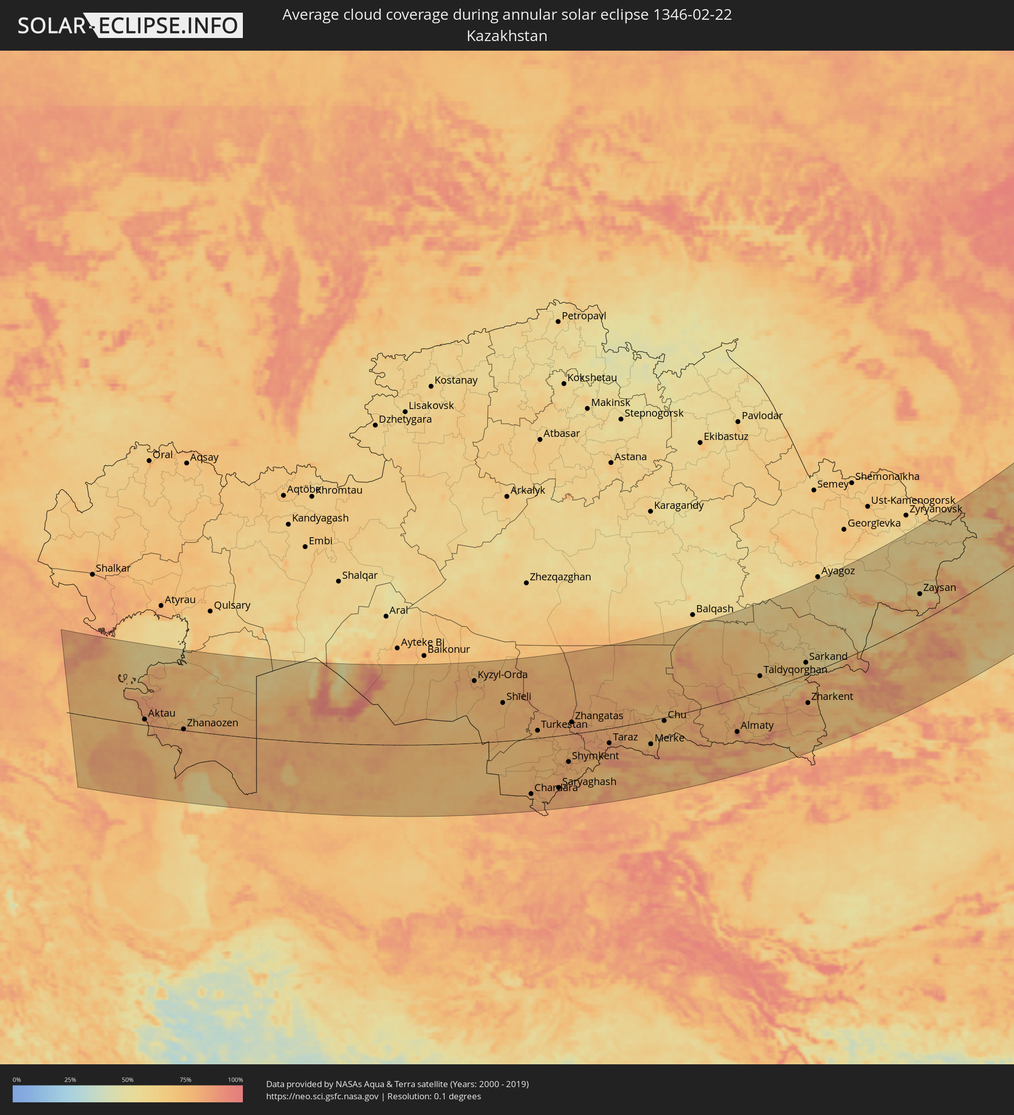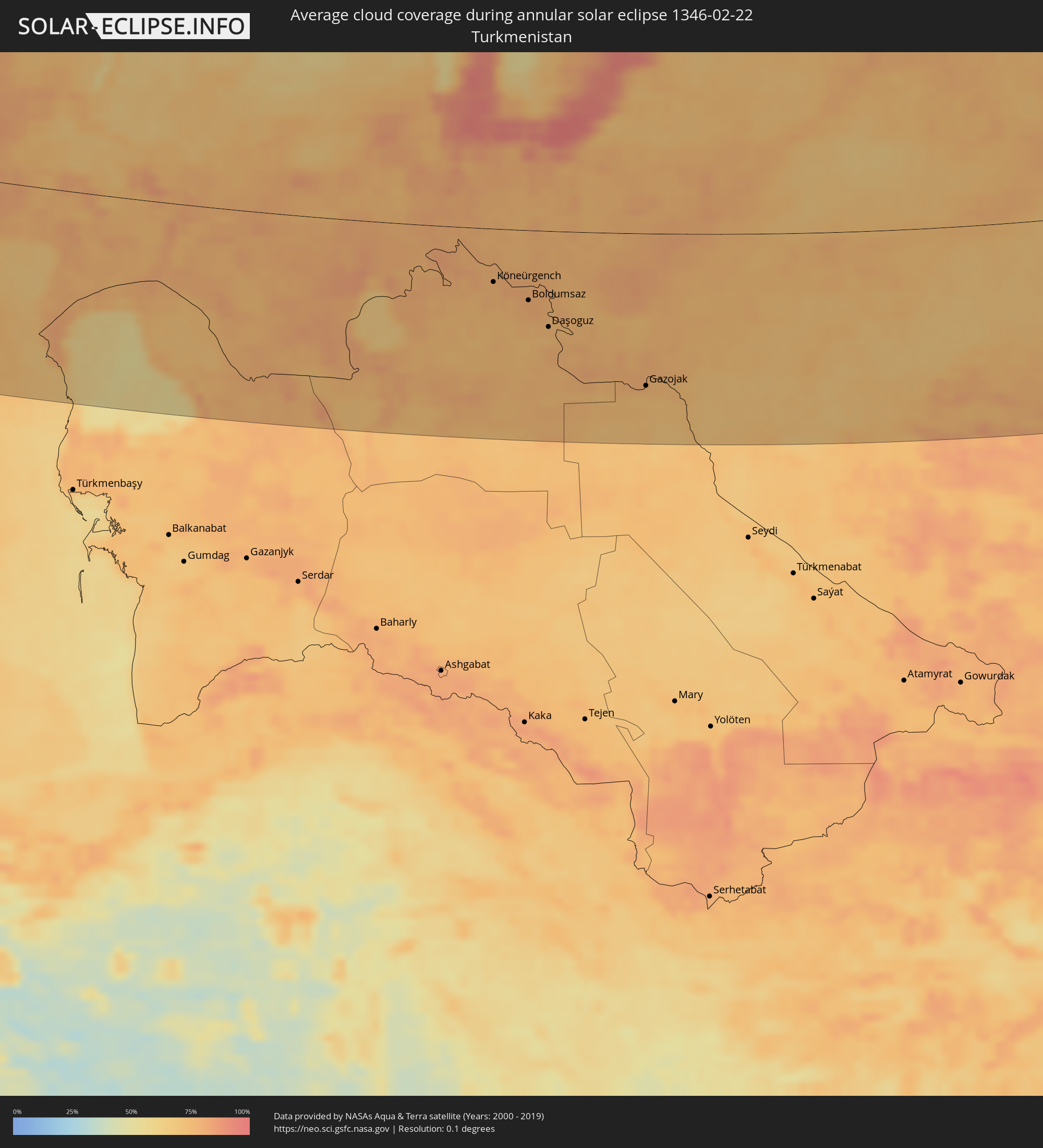 The following maps show the average cloud coverage for the day of the annular solar eclipse.