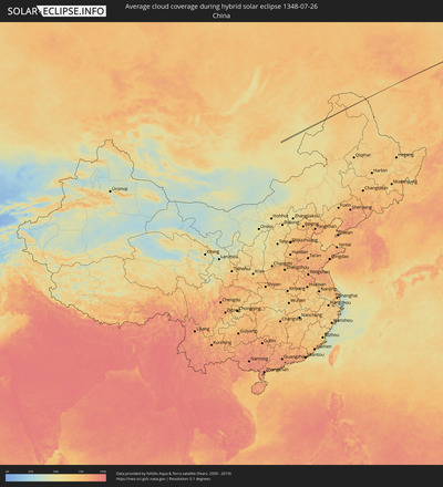 The following maps show the average cloud coverage for the day of the hybrid solar eclipse.