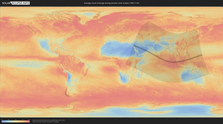 The following maps show the average cloud coverage for the day of the annular solar eclipse.