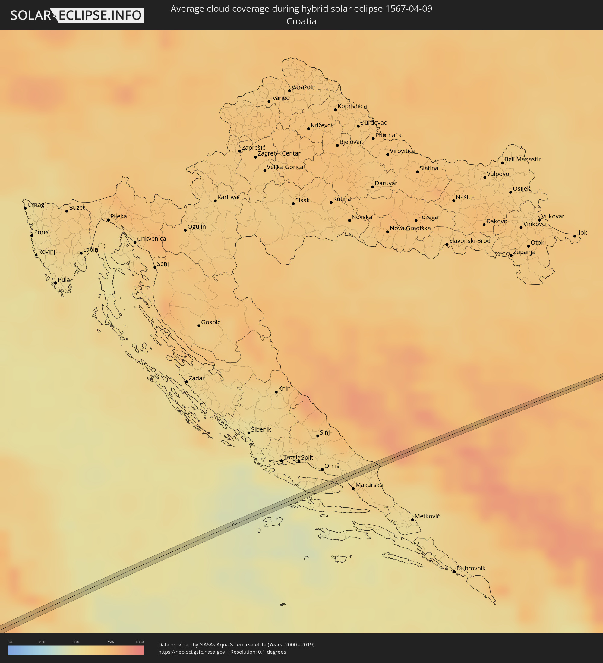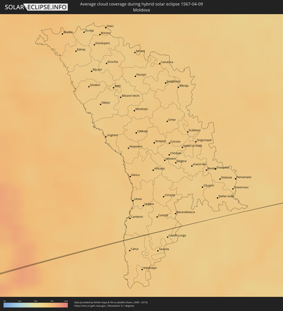 The following maps show the average cloud coverage for the day of the hybrid solar eclipse.