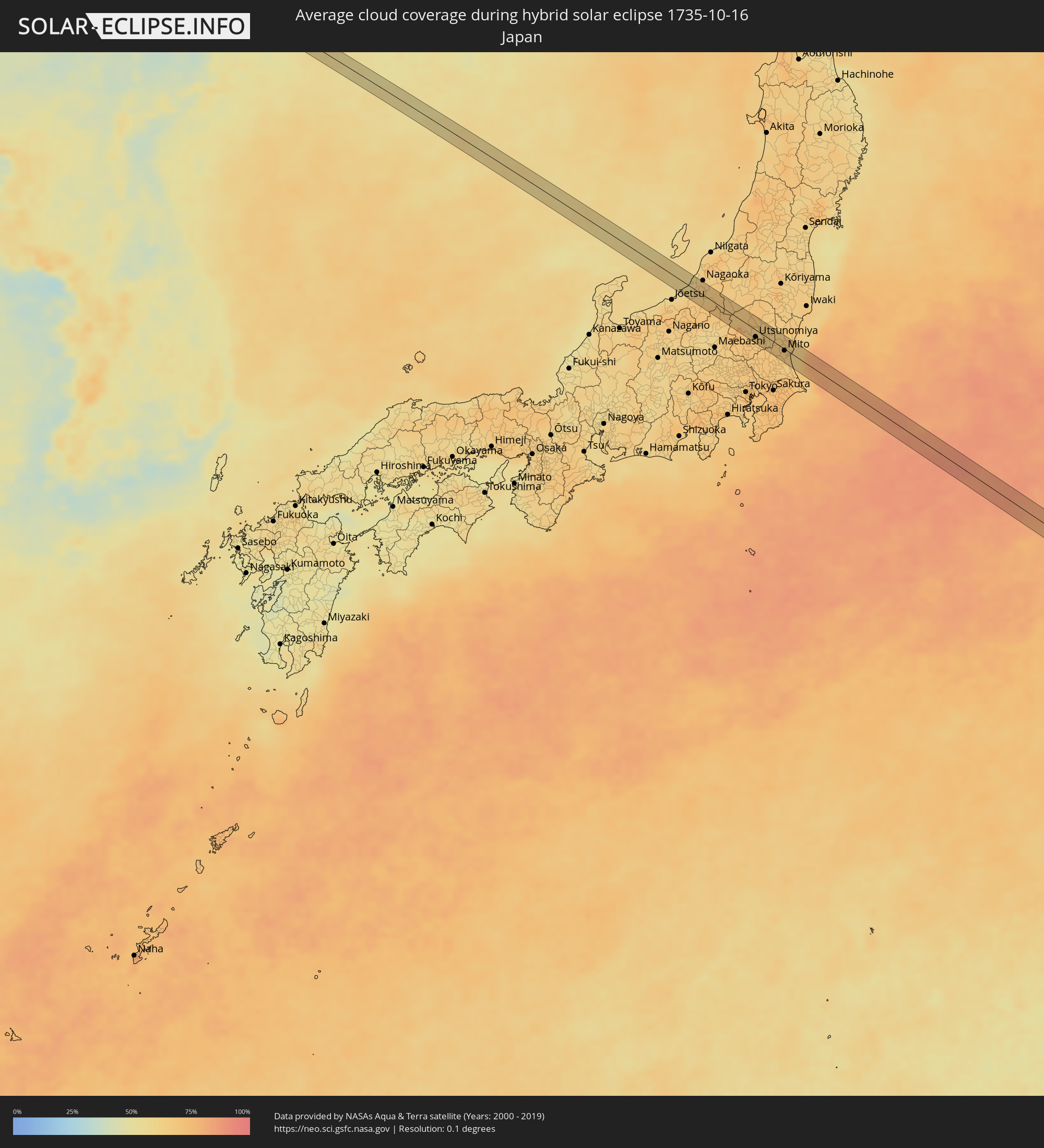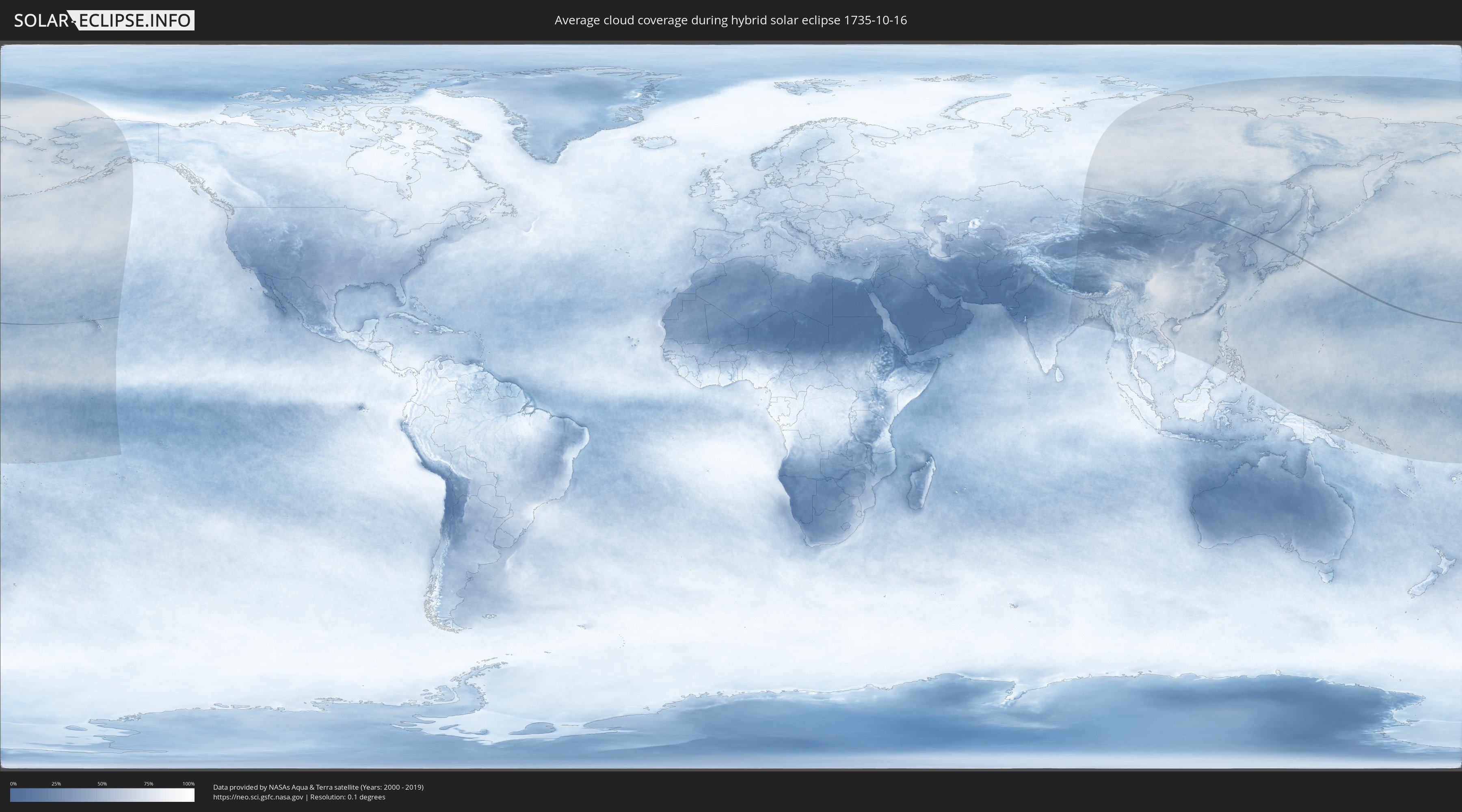 The following maps show the average cloud coverage for the day of the hybrid solar eclipse.