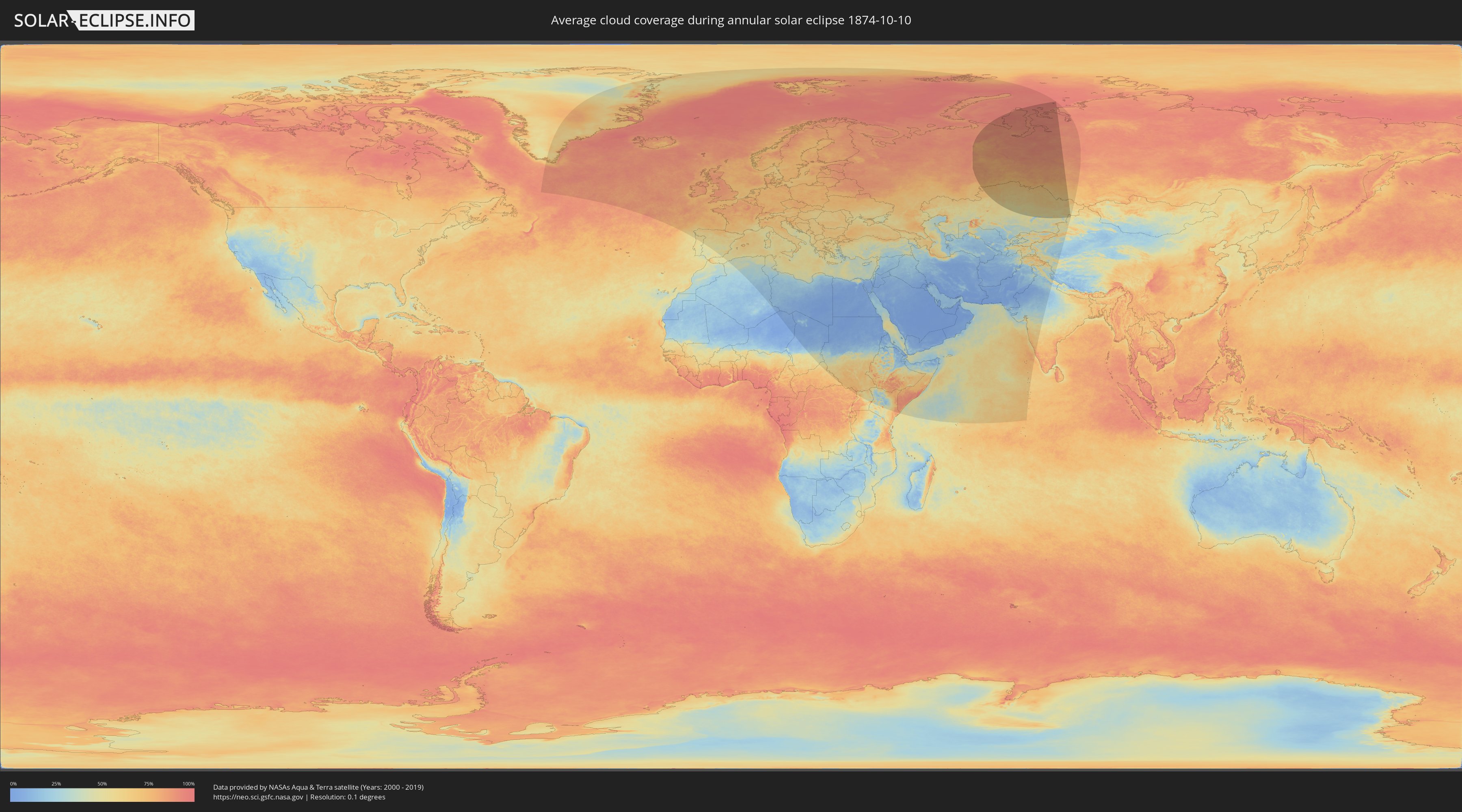 Die Sonnenfinsternis am 10/10/1874 kann man in 96 Ländern als partielle Sonnenfinsternis beobachten.