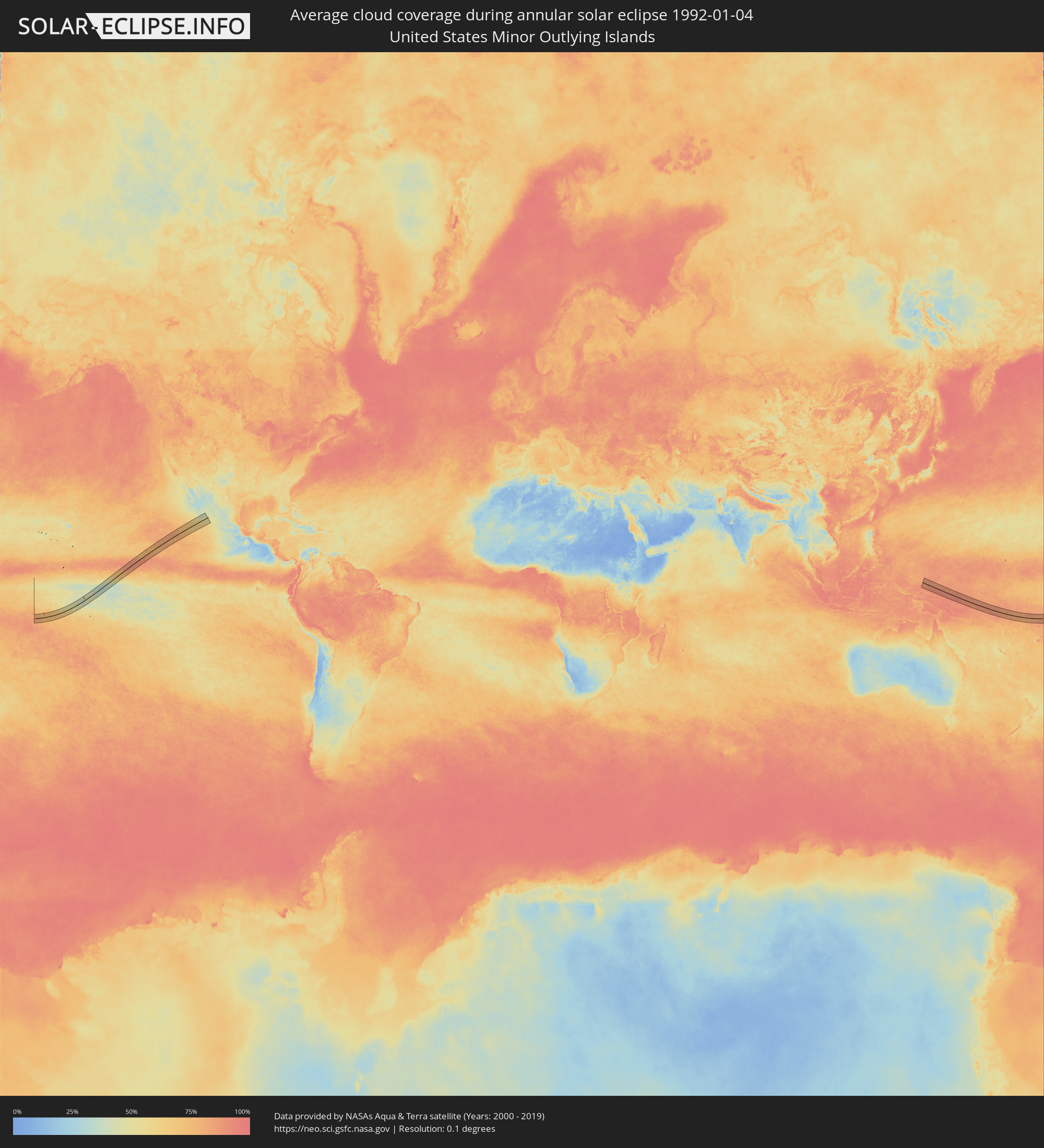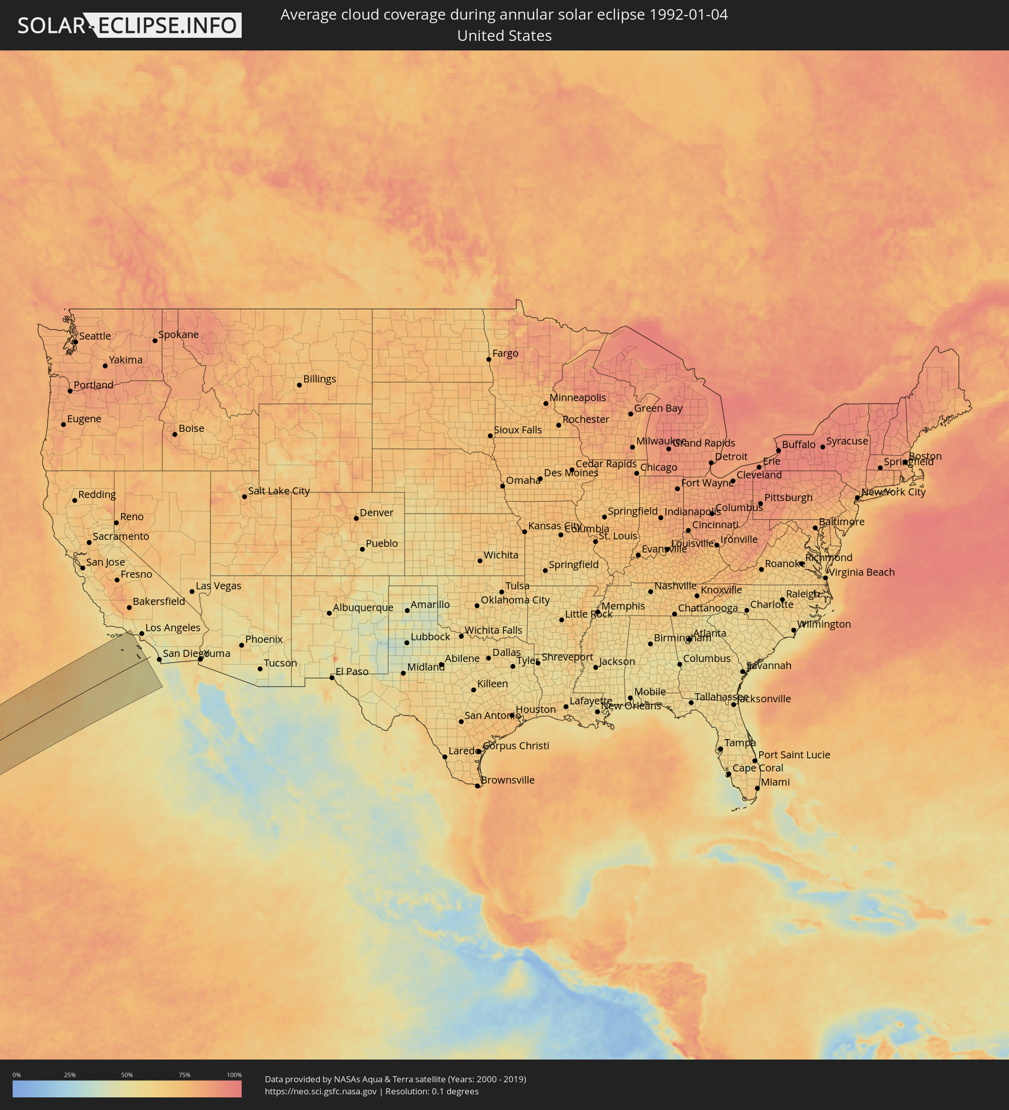 The following maps show the average cloud coverage for the day of the annular solar eclipse.