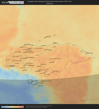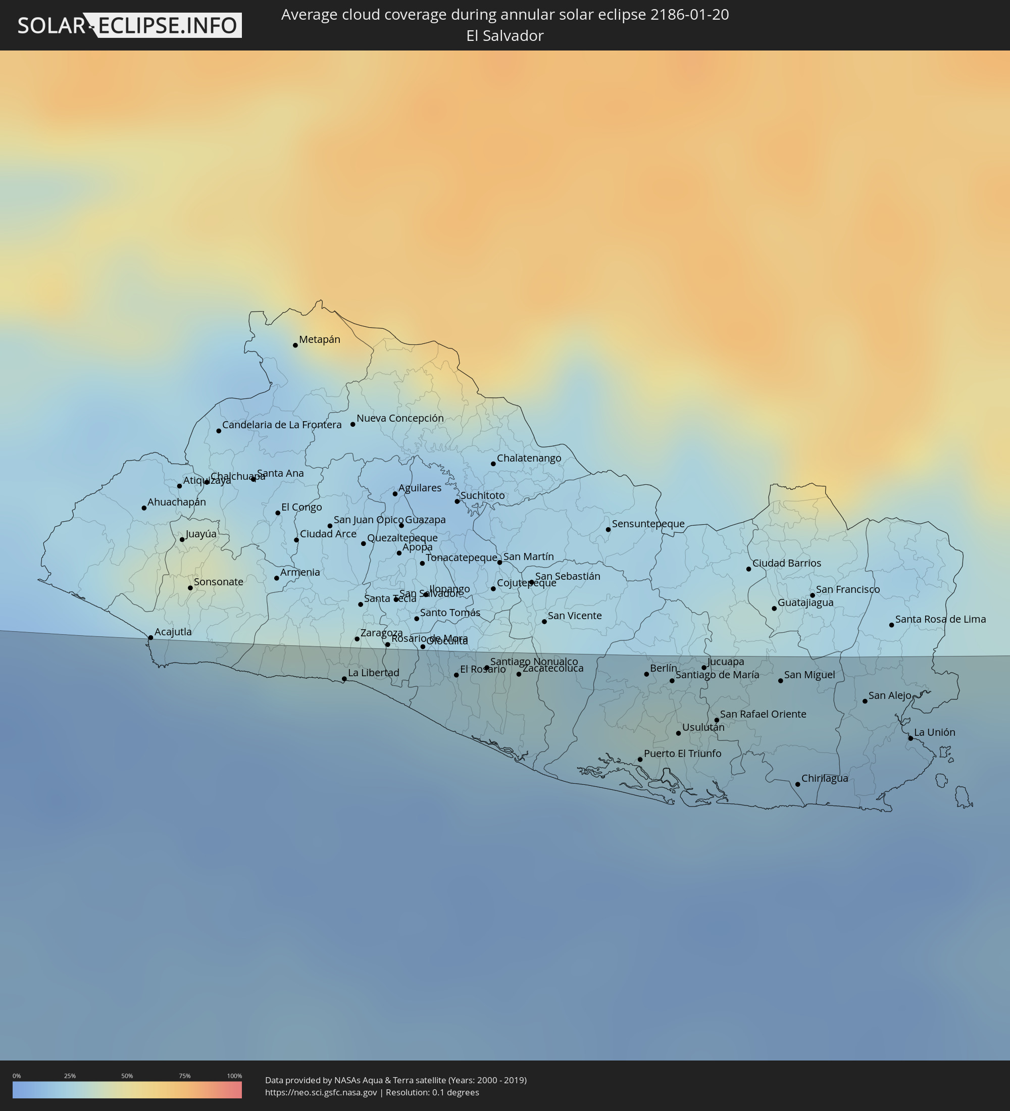 The following maps show the average cloud coverage for the day of the annular solar eclipse.