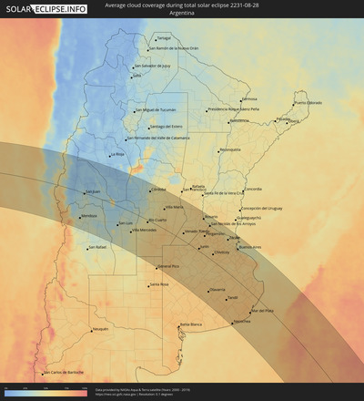The following maps show the average cloud coverage for the day of the total solar eclipse.