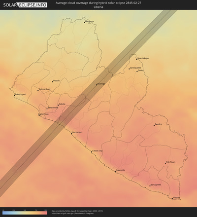 The following maps show the average cloud coverage for the day of the hybrid solar eclipse.