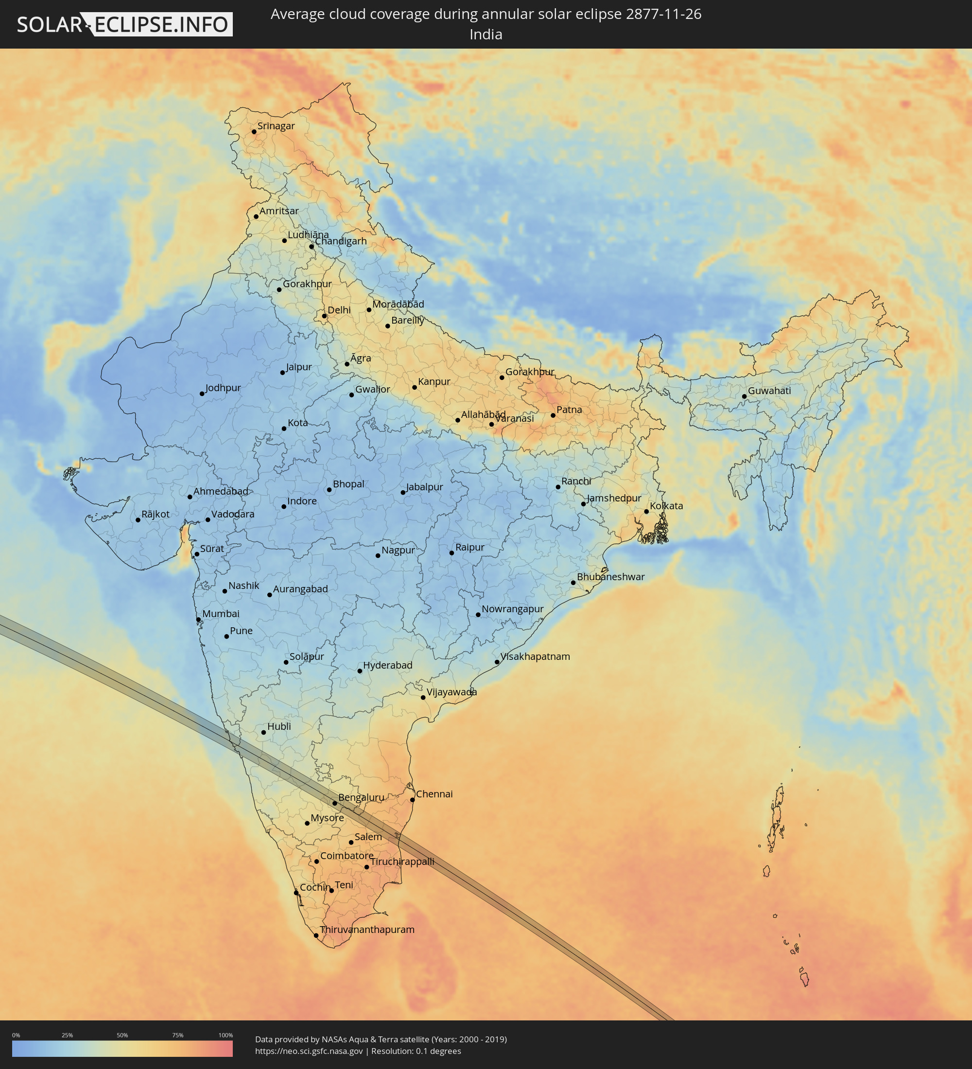 The following maps show the average cloud coverage for the day of the annular solar eclipse.