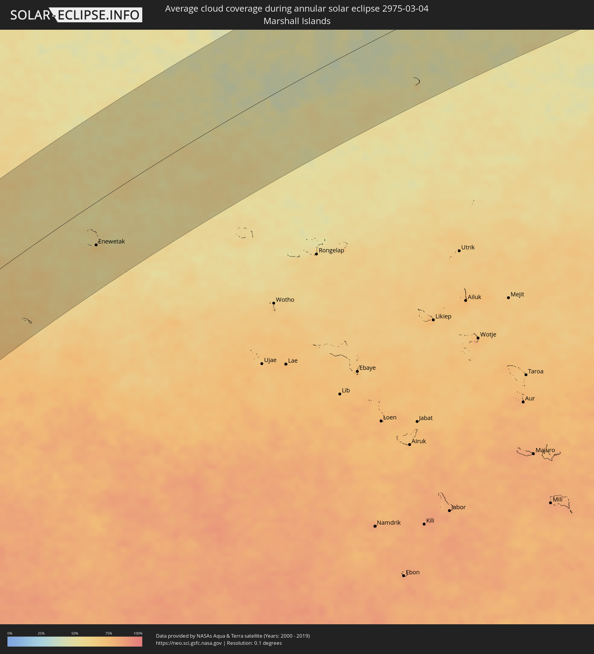 The following maps show the average cloud coverage for the day of the annular solar eclipse.