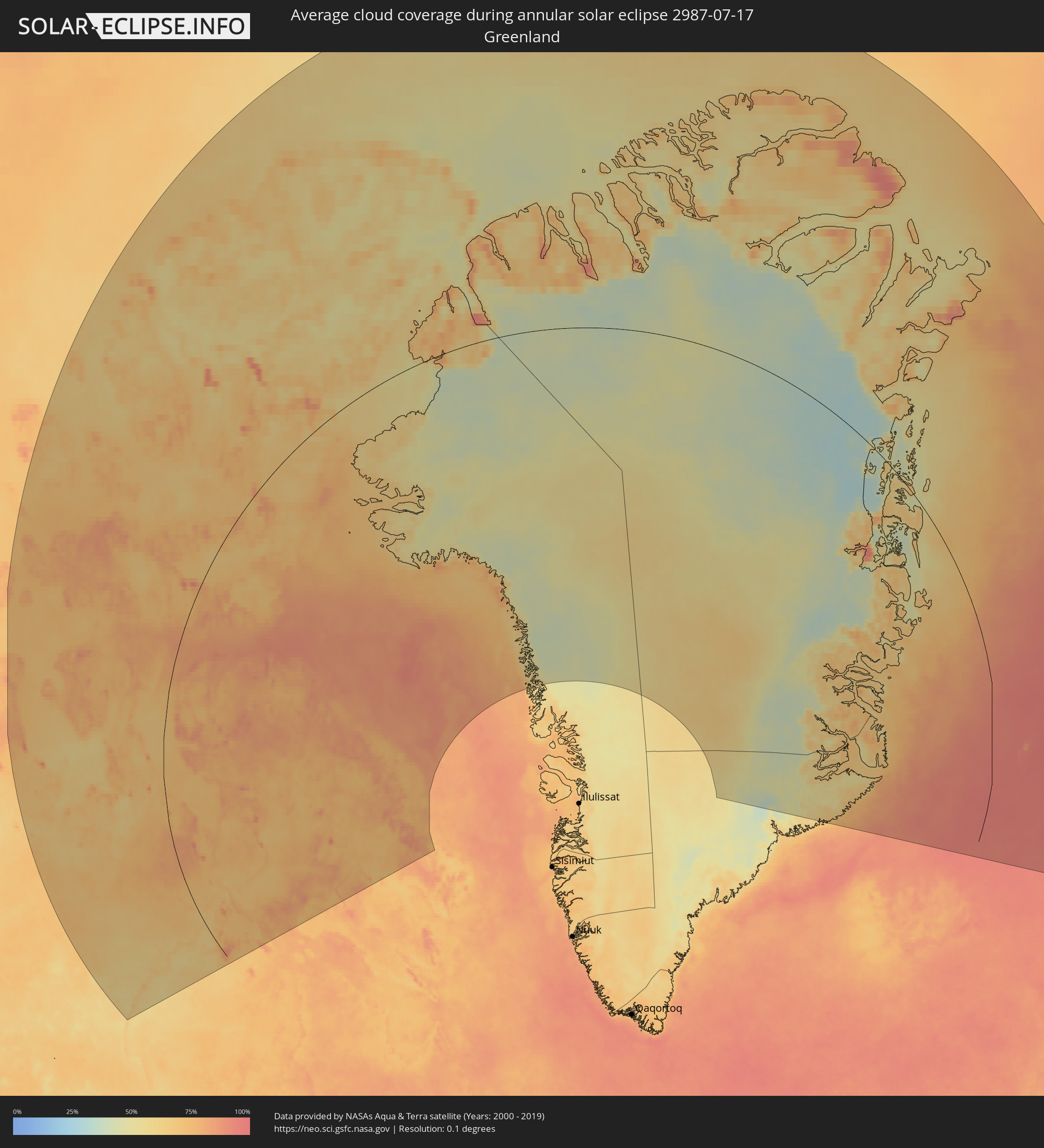 The following maps show the average cloud coverage for the day of the annular solar eclipse.
